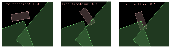 In either case the crux of the problem is preventing a body from moving in one local axis (tire should not slide sideways) while still allowing it to move freely in the other local axis (tire should be able move back and forwards). This in itself is not such a difficult feat, but the trick is getting it to feel nice for the user when they control the car. If the lateral velocity is simply killed completely the car will feel like it's on rails, and we might actually want to allow the car to skid in some situations, and behave differently on various surfaces etc. Before we get started you might like to take a look at Doug Koellmer's excellent implementation of top-down cars in Flash: qb2DemoReel.swf (click the 'Next demo' button a couple of times). This is the kind of thing we're aiming for.