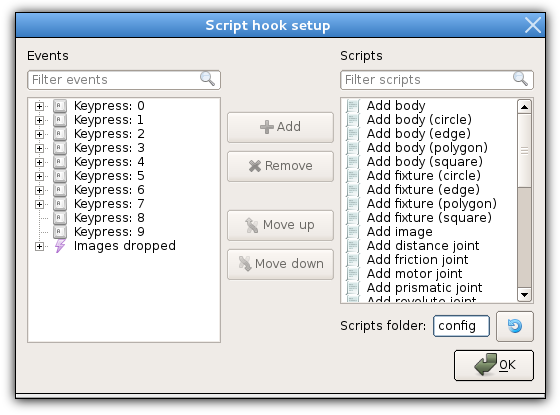 The left side of the dialog lists the events to which scripts can be attached, and the right side