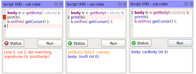 In the second image the script has now been compiled and run, but the desired body was not found. Warnings